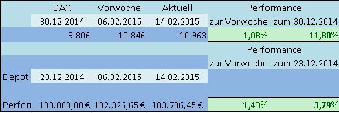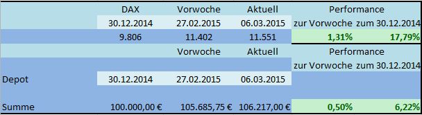 Das Depot hingegen verbesserte sich gegenüber der Vorwoche um 0,16%. So kann bis Ende Februar 2015 mit einer Depotentwicklung seit Jahresanfang von 4% gerechnet werden.