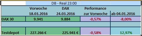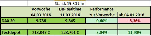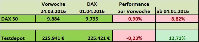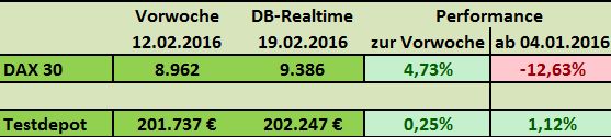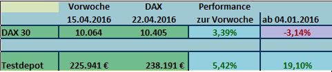 Während der DAX in der vergangenen Woche 4,7% zulegen konnte, blieb das Testdepot mit 0,25% recht bescheiden. Seit Jahresanfang hat das Depot jedoch mit 13,75% gegenüber dem DAX die Nase deutlich vorne.