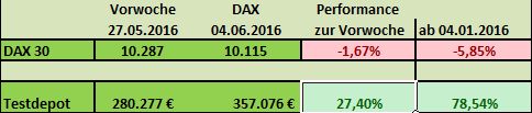 Das Depot war in dieser Woche mit minus 0,31% nicht ganz so erfolgreich, legte doch der DAX im Vergleich zur Vorwoche immerhin 0,95% zu.
