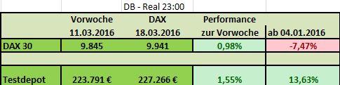 Gestern beendete der DAX eine insgesamt freundliche Woche. Er legte gegenüber der Vorwoche um 3,23% zu. Die Depot-Wochenperformance hingegen betrug 5,67%.