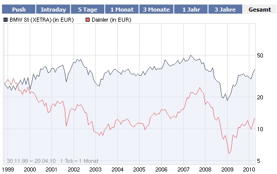 da habt ihr recht daimler ist unterbewertet und hat mehr kaufempfehlungen, aber andere experten glauben ja auch das die 35 er marke noch vor dem sommer getestet wird...deshalb meine shortempfehlung nach so einen positiven anstieg! langfristig kann man nie wissen was kommt!!z.b. eine rückrufaktion eine negative analyse usw...bei bmw gilt genau das gleiche!also wie gesagt nur meine meinung und keine schlechte kritik an Dai...lassen wir uns überraschen!! Viel Glück!!