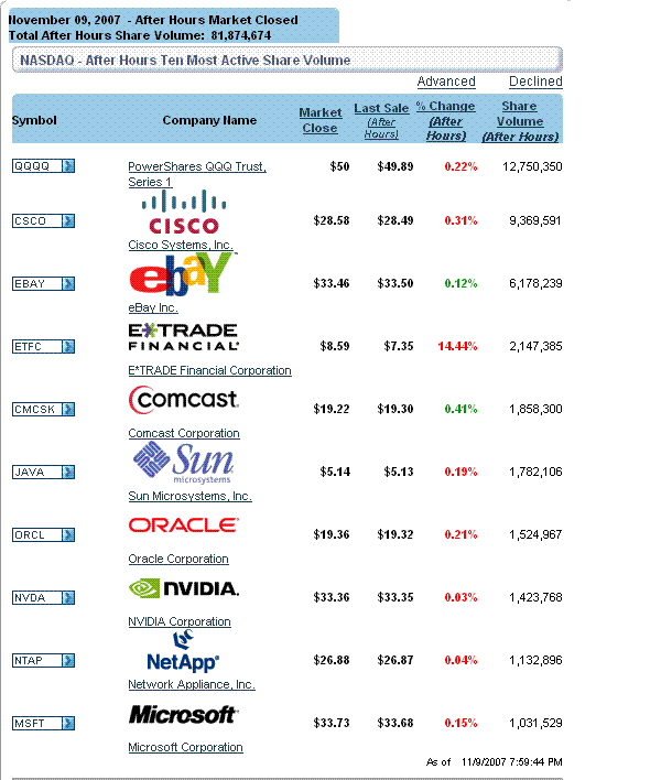 E-Trade (ETFC)fell $1.01 to last trade at $7.41.