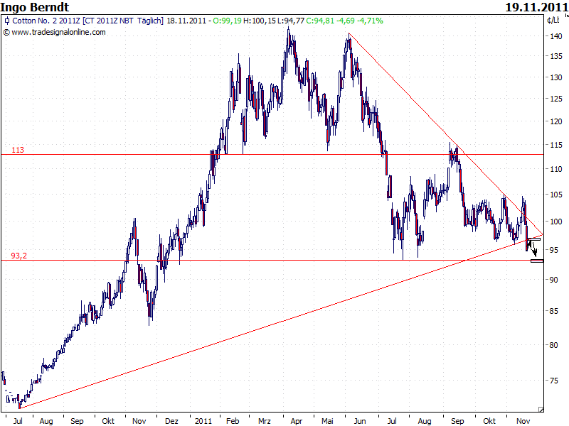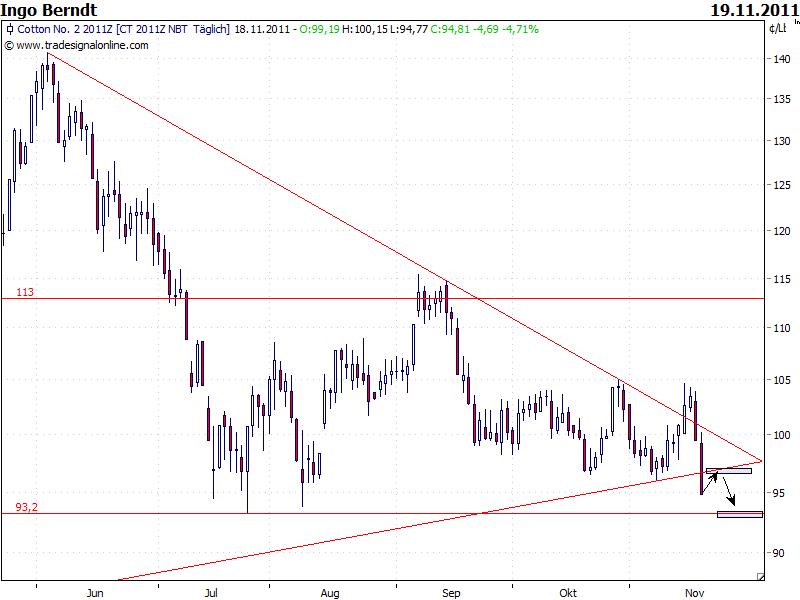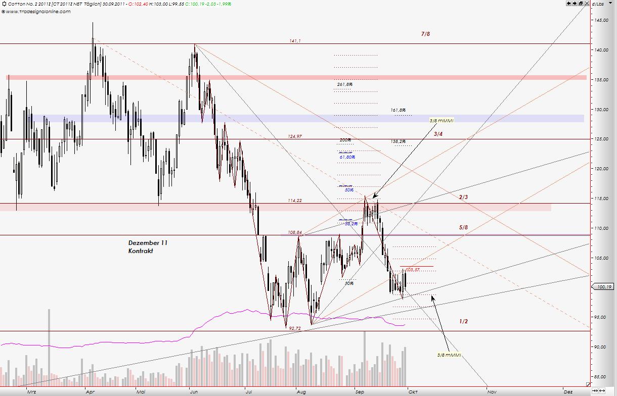 Bei mir haben die letzten Tage zur keinem Meinungsumschwung geführt: Short bleiben und SL auf 103,60, Dezember Kontrakt. Gestern machte Baumwolle Tageshoch bei 103,50. Wird Short ausgestoppt, sofort auf Long drehen, mit StopLos bei 98,10 us cent.