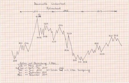 In diesem Anhang mein Wochenchart von März Kontrakt. Die Berechnung nach Master 12 Chart weisen auch hier auf mögliche Wenden zwischen Ende Januar und dann später Anfang bis Mitte März hin. Muss dazu sagen: die mögliche Wenden aus dem Master 12 Chart sagen nicht ob es ein Tief oder ein Hoch sein wird, sondern lediglich, dass es dort mit einer Warscheinlichkeit zur Trendänderung kommen kann. Vergleicht man aber diesen Chart mit dem Zykluschart, werden diese Zeiträume etwas verständlicher.