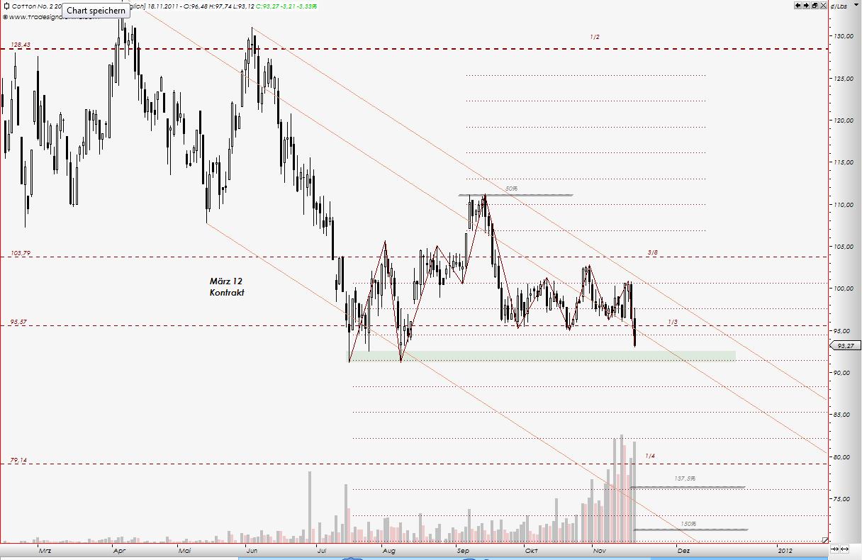 Kurzfristig gehen, ging ich mit meinem Short davon aus, dass wir noch mal Tiefs bei 92 sehen werden, wo ich dann Short auf kurzfristigen Long wechseln kann. In den letzten Tagen jedoch fand Baumwolle im Bereich von ca. 98 eine Unterstützung und jetzt besteht für mein Short die Gefahr, dass die gebrochene 1*1 Winkellinie im Tageschart wieder nach oben erobert werden kann, was wiederum für kurzfristige Stärke sprechen würde. Ausschlaggebend hierfür wird die Kerze von Donnerstag sein.