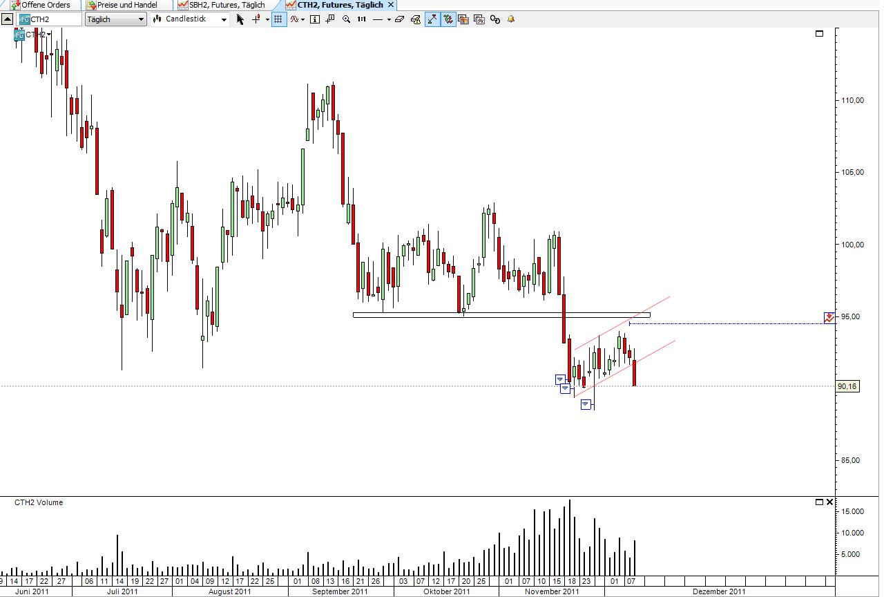 per Definition hat sich kurzfristiger Trend nach unten gedreht, somit Short. Zunächst bis 92,72us cent - Dezember Kontrakt.