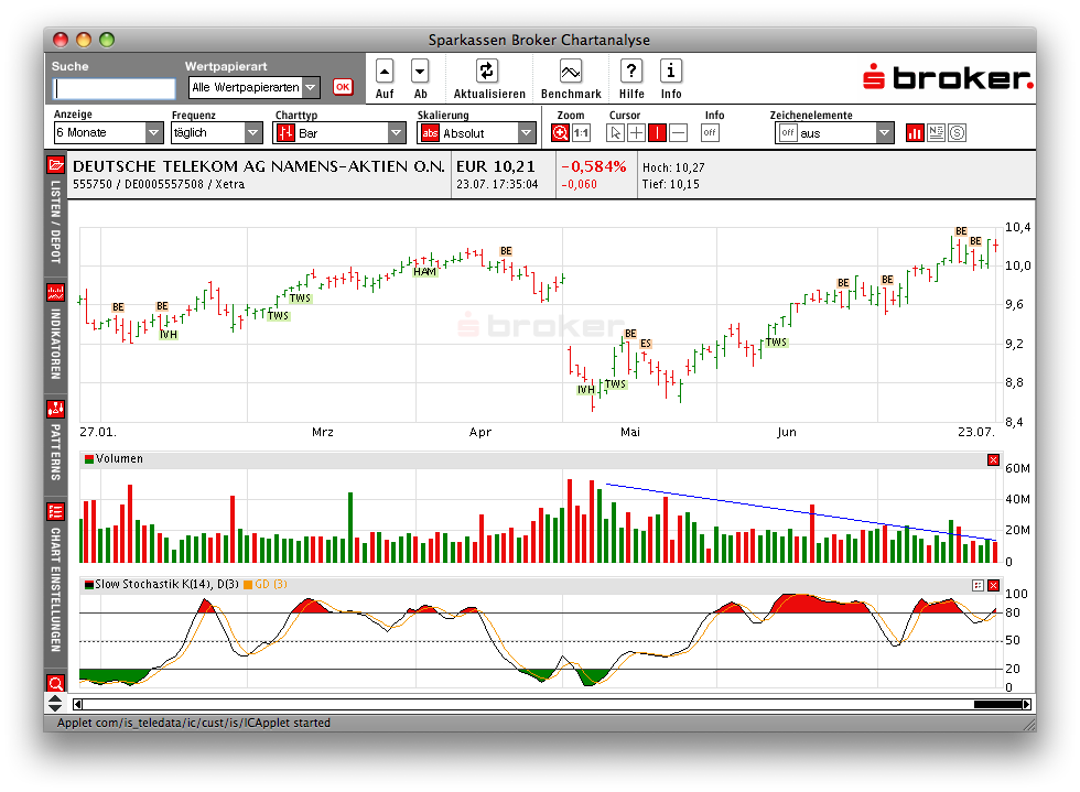 Nochmals Telekom, in diesem Chart habe ich mir die Frage gestellt, ob wir kurzfristi­g eine Topbildun sehen werden. Dazu müssten allerdings­ die Volumen (Rot und Grün) anziehen, denn ansonsten kann es mit wenig Volumen langsam nach oben schaukeln.­ Dazu müssten sich der Gesamtmark­t jedoch stabilisie­ren.