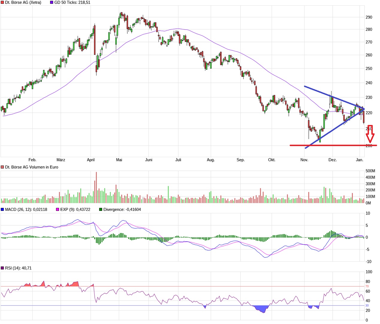Derweil gerät nun das Aufbäumen der Aktie seit November ziemlich sicher zum Fehlausbruch. Nun ist die Aktie schon wieder unter der horizontalen Unterstützung von 220 Euro.