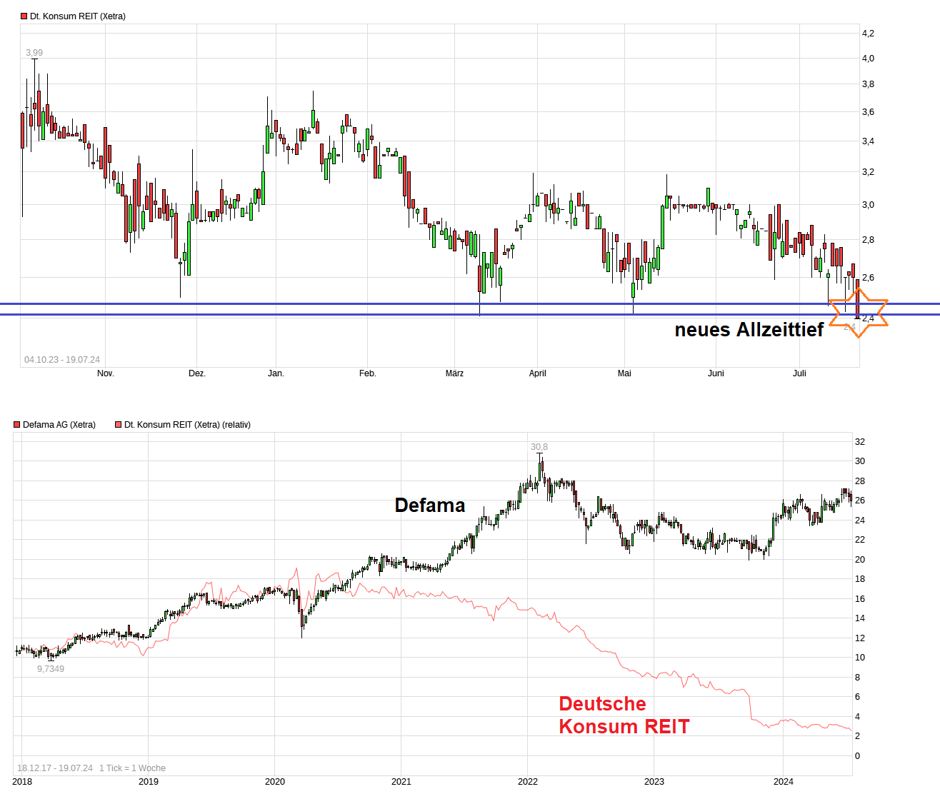 Deutsche Konsum REIT droht Verlust des REIT-Status - hohe Abschreibungen nötig -22.07.2025 - https://www.4investors.de/nachrichten/...?sektion=stock&ID=184836 "....Die Deutsche Konsum REIT-AG rechnet für das dritte Quartal ihres laufenden Geschäftsjahres mit einem Abwertungsbedarf in Höhe von rund 41 Millionen Euro. Hintergrund ist eine neue Bewertung des Immobilienportfolios, das zum 30. Juni 2025 bei etwa 794 Millionen Euro liegt. Das entspricht einem Rückgang von 4,9 Prozent gegenüber dem Stand vom 30. September 2024. Mit dieser Entwicklung wird die Deutsche Konsum REIT-AG die im REIT-Gesetz vorgeschriebene Eigenkapitalquote von mindestens 45 Prozent voraussichtlich auch zum Geschäftsjahresende am 30. September 2025 nicht erreichen. Infolge dessen dürfte die Gesellschaft ihren Status als steuerbefreiter REIT verlieren. Die Deutsche Konsum REIT-AG führt nach eigenen Angaben weiterhin Gespräche mit Gläubigern zur Umsetzung einer geplanten Sanierung. Diese sieht unter anderem Immobilienverkäufe in Höhe von bis zu 350 Millionen Euro bis Ende 2027 vor. Man wolle die Verhandlungen bis Ende August 2025 abschließen.