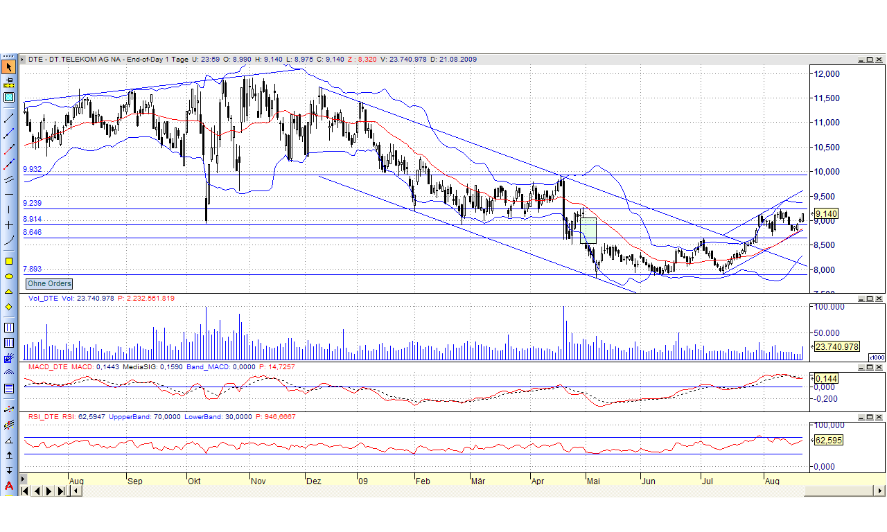 Bei der Dt. Telekom liegt mein SL bei 8,92 €, solange dieser Wert auf SK nicht unterschritten wird, bleibt die Position im Depot, nach oben hin ist noch etwas Platz...