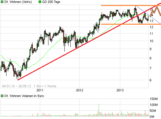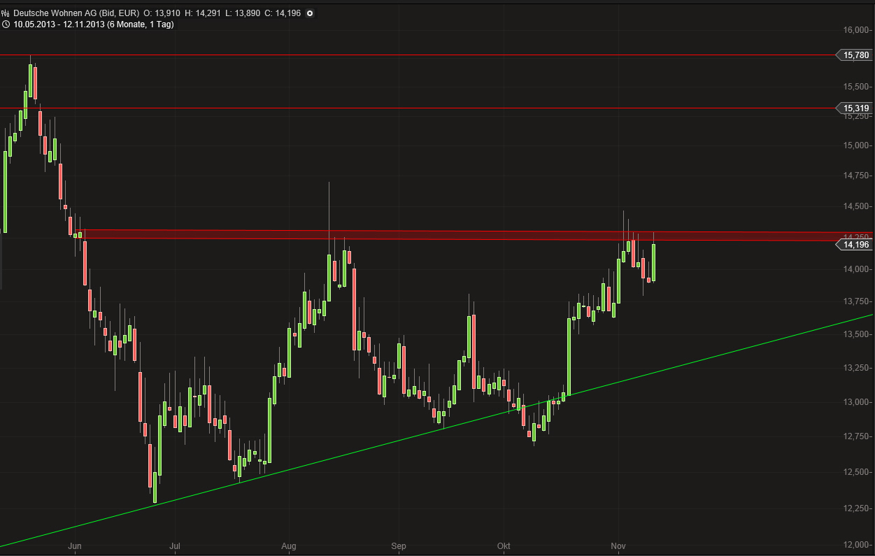 Unter Zugzwang kamen in den letzten Tagen die Käufer in der Deutschen Wohnen Aktie, denn nachdem die Kurse temporär unter die Aufwärtstrendlinie zurückfielen, stand der Bullenmarkt zur Disposition. Dieser konnte bisher noch verteidigt werden und auch heute ziehen die Kurse wieder deutlich an. Damit bleiben die Chancen auf neue Hochs bis hin zu 15,00 Euro und mittelfristig auch 17,20 Euro erhalten.