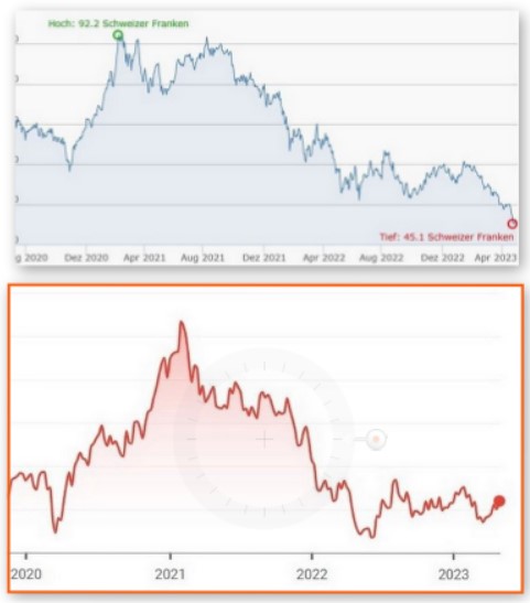 Der Aktienkurs sank dagegen von 48,10 CHF am 21.4. auf 45,45 CHF aktuell (minus 5,5%).