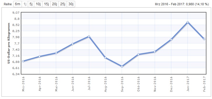 Alle Rohstoffe Unterliegen starken Schwankungen. Angebot und Nachfrage bestimmen hier den Markt. Die Ernte unterliegt auch einigen Risiken.