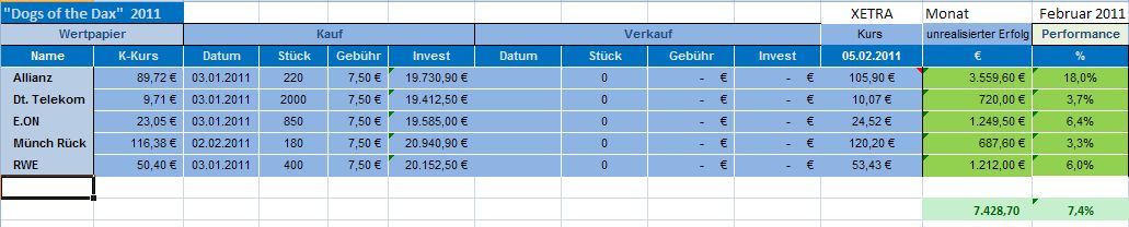 Gestern wurden zwei Dogs wegen Erreichen der StoppLoss-Marken verkauft. Es handelte sich um die DTE und die RWE. "Dogs of the DAX" Depot wurden nicht, wie in Posting #13 berichtet, Zwischengewinne von 9,50 € und 585 € realisiert, sondern von 530 € und 1126 €, insgesamt 1.656 €. Bei den anderen Beträgen handelte es sich um die Gewinnrealisierung im Investor 2011 Depot.