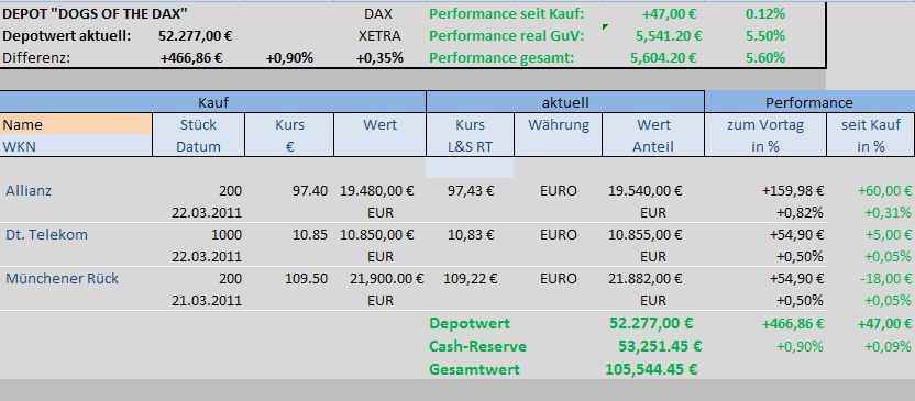 Verlustreiche Woche - Depot update Die Ereignisse­ in Japan aber auch in Libyen führten zu Beginn der Woche zu deutlichen­ Kursrückgä­ngen an den internatio­nalen Aktienmärk­ten. Auch der DAX und somit auch die DOGS waren davon betroffen.­