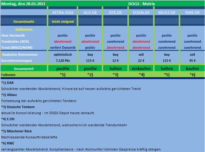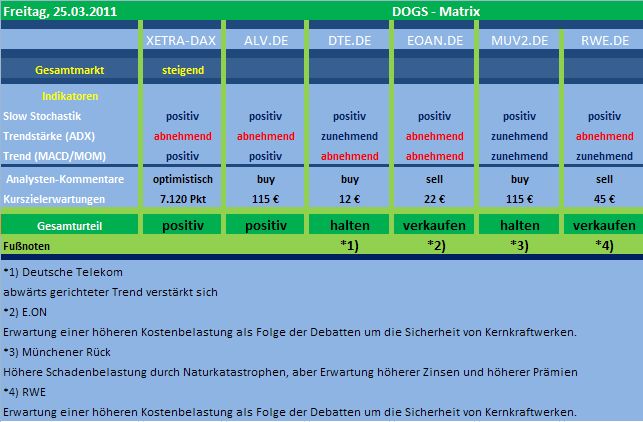 DOGS-Matrix mit Kurzinfos Für die 5 DOGS habe ich eine Matrix zusammenge­stellt, in der die wichtigste­n Daten zusammenge­faßt werden und für die Handelsstr­ategie verwendet werden.