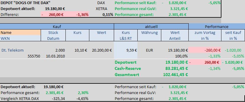 Die heutige Performanc­e vom DOGS-Depot­ war mit 0,44% gegenüber Freitag deutlich besser als diejenige vom DAX mit minus 0,11%.