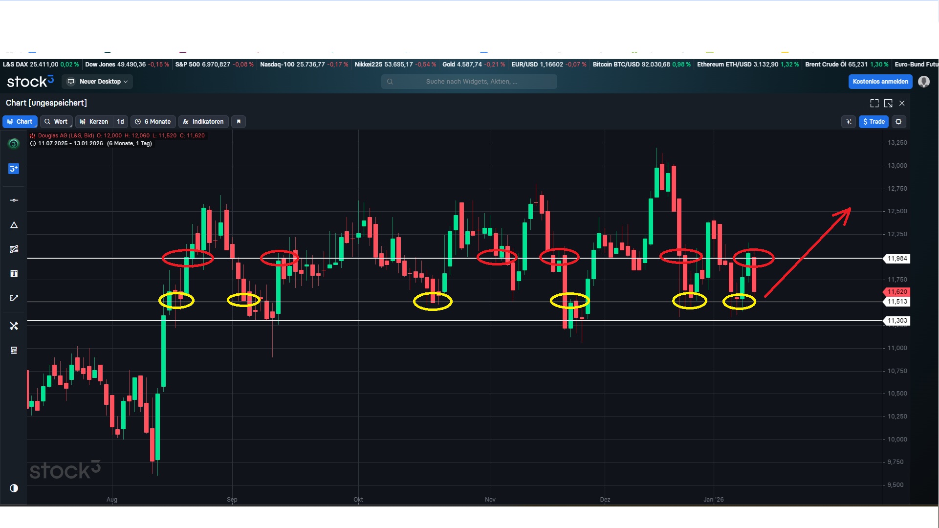 Wie man sieht bewegt sich Douglas schon länger seitlich und bildet um die € 11,50.- einen scheinbar festen Boden. Nachhaltig möchte man die € 12.- noch nicht knacken, aber sollte es in sehr naher Zukunft dazu kommen sehe ich schnell Kurse um die € 14.- bevor die Kursziele der Deutschen Bank und Jeffries von € 16.- kommen. Volumen oberhalb von € 12.- um einiges höher als darunter. Das zeigt mir zumindest das hier einige Käufer am Markt sind. Ende der Woche denke ich werden wir wieder nahe der € 12.- stehen. Für mich zur Zeit bei diesen Kurse ein klarer Kauf. Meine Meinung/Ansicht.