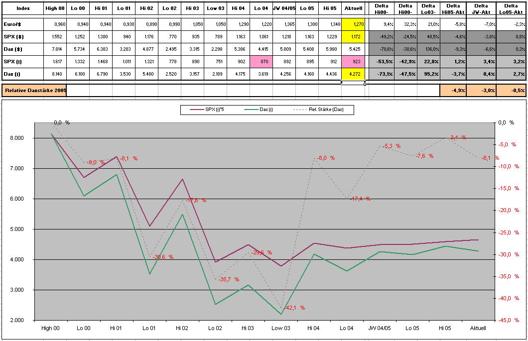 Aber generell ist es sehr schwer, verschiedene Indizes 1:1 zu vergleichen. Über einen langen Zeitraum hinweg ergeben sich auf jeden Fall Parallelen. Allerdings darf man dann die Währung nicht außer Acht lassen. Das ist übrigens auch der Grund, wieso der Dax heute nicht stärker fällt. Das wird wohl jetzt noch ne Weile so bleiben. Hier mal ein Vgl. SPX/Dax in Euro gerechnet.