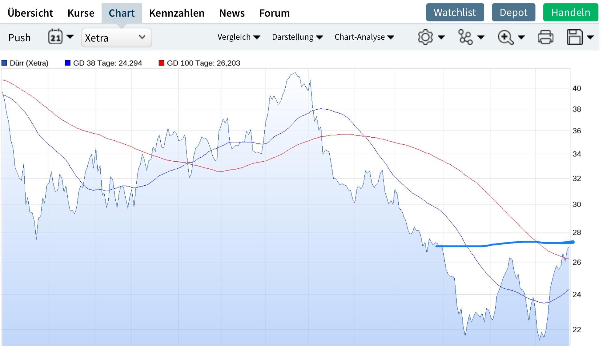 weit unter dreissig Euro. In diesem Fruehjahr hatten wir Duerr-Kurse von 42,-- und 37,12 Euro.