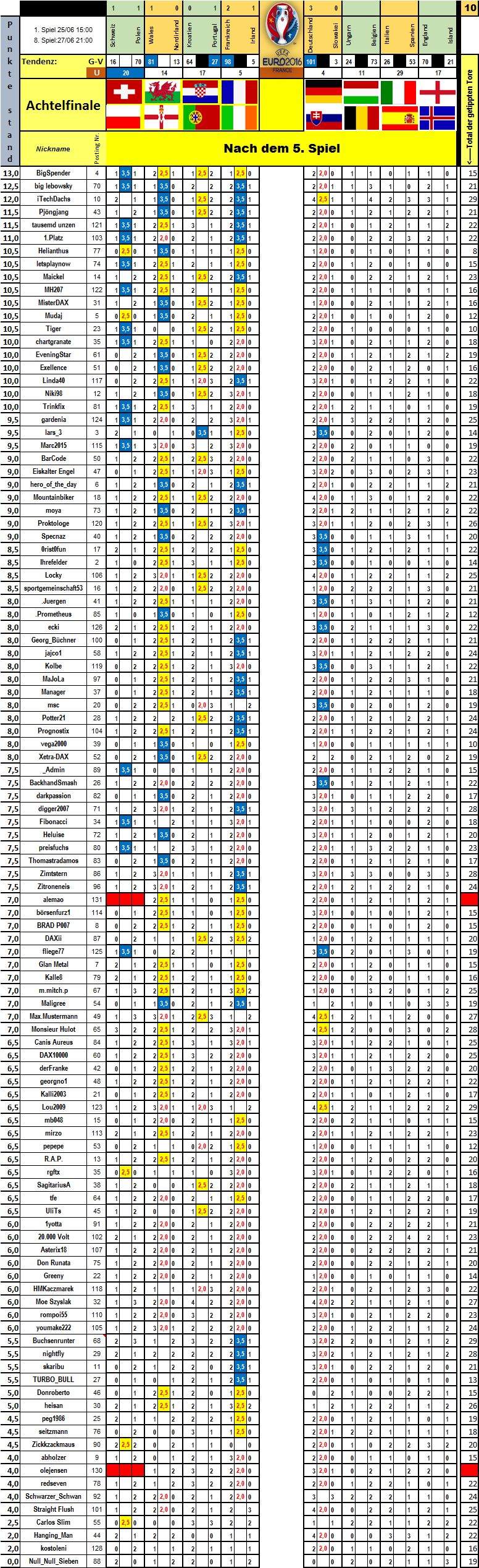 Von den 6 Achtelfinalen hätte ich 5 mal richtig gelegen. Aber wer kann schon Not gegen Elend tippen. Zu Wales hatte ich keine Meinung.