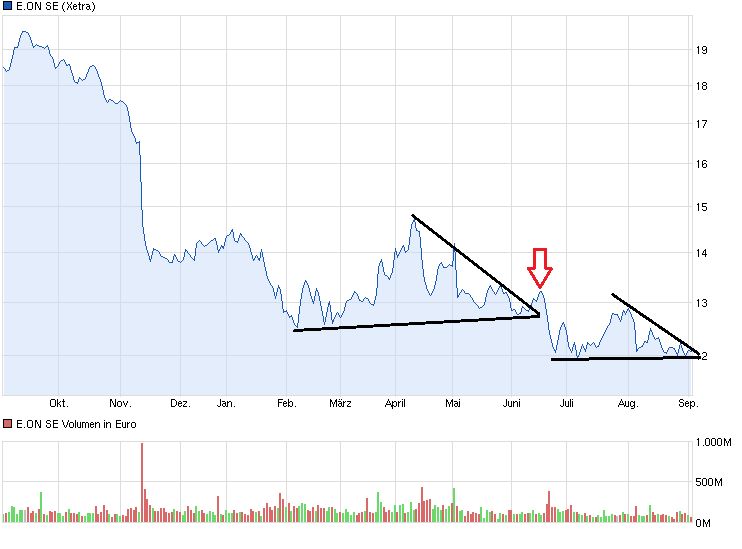 13 wäre für Eon die Rettung auf EoD- und EoW-Basis und dennoch für den übergeordneten Abwärtstrend ohne jegliche positive Bedeutung. So weit ist Egon schon.