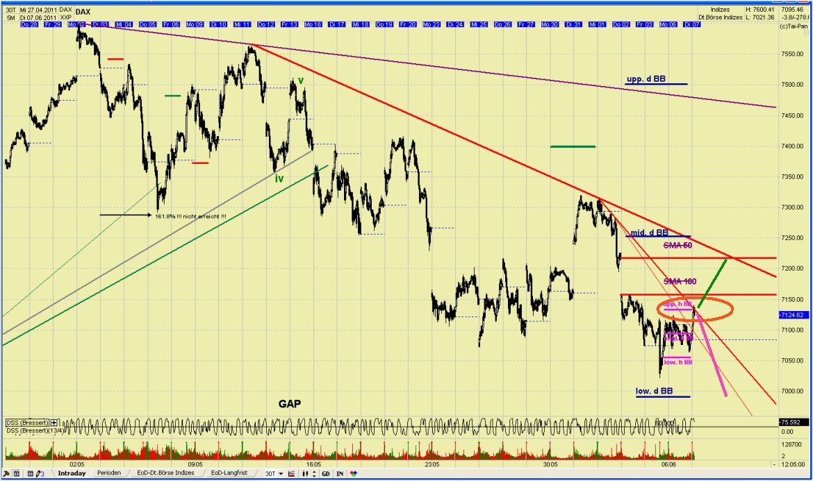 Nach dem Bruch der 0-ii Linie (deren Beginn wurde bei 7151 angenommen), erfolgte die übliche Korrektur - möglicherweise in der Welle iv - ab 7265 könnte nun die Welle v laufen. Wird die ab 7151 über 7265 gezogene Linie gebrochen, dürfte eine stärkere Korrektur starten (siehe Indikatoren). Wie es momentan ausschaut, dürfte das mittlere TBB auch heute wieder die Entscheidungsmarke werden.