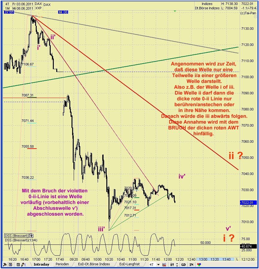 Aufwärts muss ein Impuls her und abwärts würde ein "in-time down" unter 7034 die nächste Welle einläuten. Diese Details sind nicht ableitbar.