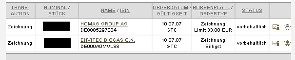 Der Ausgabepreis der EnviTec Biogas-Aktie liegt mit 47€ in der Mitte der Bookbuildingspanne und lässt damit für die Glücklichen auf einen Zeichnungsgewinn von mindestens ca. 10% hoffen. Trotz der Möglichkeit 5 Zeichnungsaufträge bei der DresdnerBank abzugeben, bin ich leider leer ausgegangen.