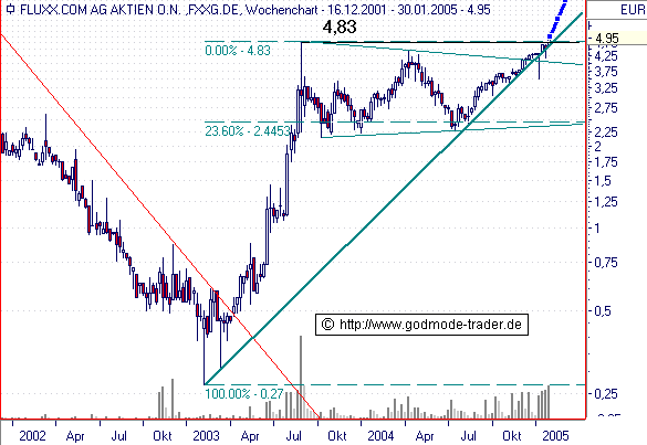 Diagnose: Die FLUXX Aktie hatte im Februar 03 ihr AllTimeLow bei 0,27 Euro markiert. Danach erfolgt ein rasanter Anstieg bis August auf ein Hoch bei 4,83 Euro. Ausgehend von diesem Hoch ging sie in eine lange Seitwärtsbewegung. Obwohl sich die Aktie dabei mehr als halbierte, fiel sie nur kurzzeitig unter das log. 23,6% Retracement. Diese Seitwärtsbewegung lässt sich in einem symmetrischen Dreieck eingrenzen. Bereits im Dezember brach die Aktie aus dem Dreieck nach oben aus. In dieser Woche versucht die Aktie nun das Hoch aus dem August 03 zu überwinden.