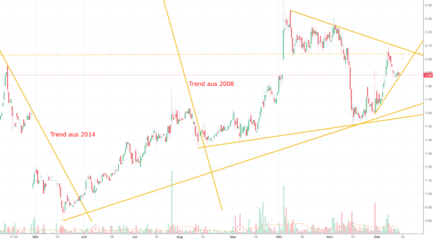 Demnach war es ja ungünstig (wie ich geschrieben hatte) nicht bei Kursen unter 1,40 gekauft zu haben, nur weil bis dahin der langfristige Abwärtstrend noch intakt war.