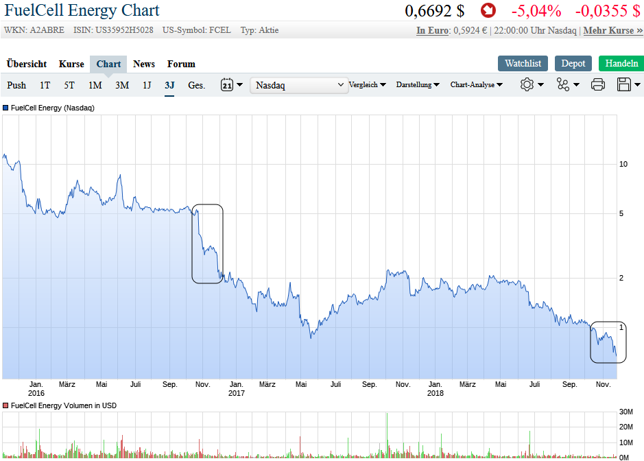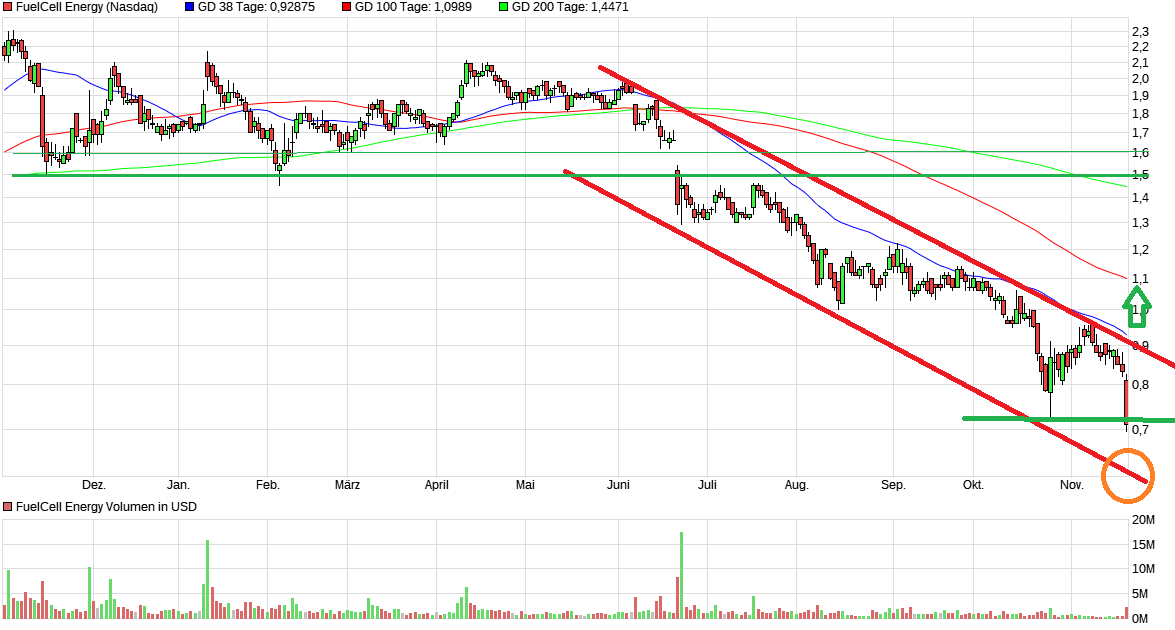bei fcell heißt es weiter FINGER WEG. das eisen ist sehr heiß !! positiv zu werten ist das der ausbruch nach unten aus dem stelen downtrend in einen noch steileren downtrend negiert wurde . wir sind zurück im alten trend. es besteht die möglichkeit eines konters bis in den bereich von 0,80$. wahrscheinlicher aber ist ein nochmaliger test der tiefstkurse. ein erneuter rausfall aus dem trend wäre ein brandbeschleuniger.