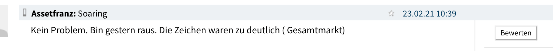 Und genau da stelle ich meine Kauforder hin. Ich habe ja nur meine Einschätzung preis gegeben. So wie du deine preis gibst. Nur keine Panik. Ich liege bestimmt falsch.