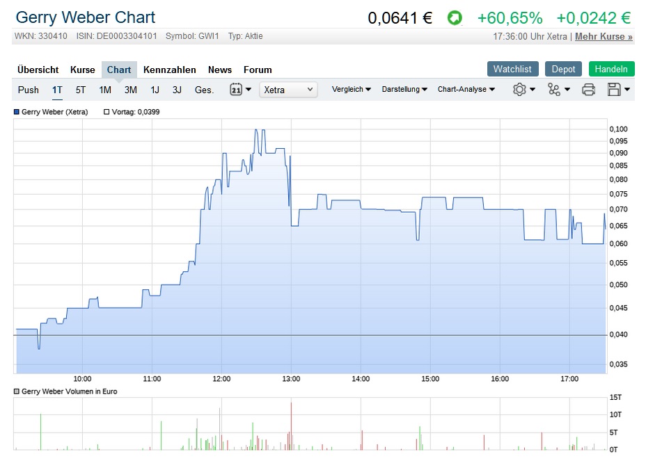 18.09.2019 - Gläubiger der Gerry Weber AG stimmen dem Insolvenzplan zu Nur die Aktionäre sind sauer - https://www.westfalen-blatt.de/OWL/Bielefeld/...Aktionaere-sind-sauer "...Von sechs Gruppen hat lediglich die der Aktionäre überwiegend mit Nein votiert. Sie ist auch die einzige, die bei der Insolvenz leer ausgeht....Alle erhalten etwas, nur wir nicht«, schimpfte ein Kleinaktionär aus Werther. Ein Anteilseigner aus Warburg musste immerhin 50.000 Euro in den Wind schreiben. Ein anderer ärgerte sich, dass er seine 40 Aktien nicht beim Kurs von 36 Euro verkauft hatte. Erworben hatte er sie zu acht Euro..."