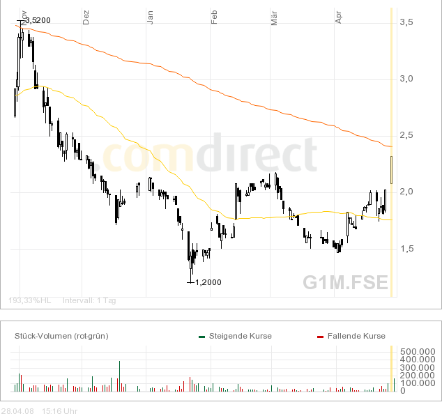nach dem hype auf knapp über 2,50 sind mer nun wieder langsam runter getröpfelt! wo bleibt der optimismus? täglich wieder mer verkäufer als käufer und das bei den vor kurzem veröffentlichten zahlen!? das allgemeine umfeld ist aktuell auch tragbar. wo liegt das problem? außer das die großinvestoren fehlen... ;-)