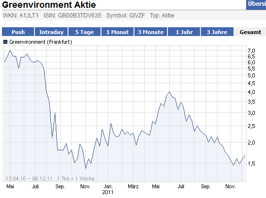 Profiteers stocken ihre Positionen in Greenvironment (WKN: A1JLT1) jetzt noch einmal kräftig auf. Wo findet man aktuell die Chance auf einen Verzehnfacher bei diesem exzellenten Chance-/Risikoverhältnis? Das Kurs-Gewinn-Verhältnis liegt auf Basis der 2012er Prognose bei 2,5.