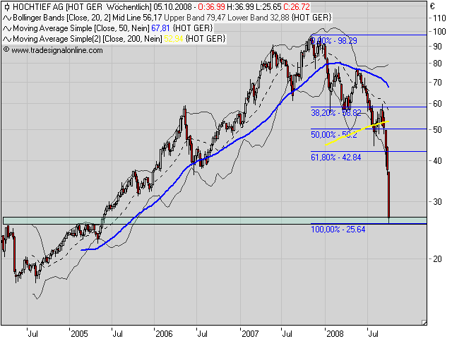 bis der Chart eine Bodenbildung zeigt oder ein Kaufsignal geliefert hat? Dann verliert ihr vielleicht die ersten 10 % des Anstiegs. Das ist aber immer noch besser, als im freien Fall das vermeintliche Schnäppchen aufzufangen (# 68) und nun auf 50 % Verlust zu sitzen. Selbst wenn Hochtief nicht mehr weiter fallen sollte (unwahrscheinlich, aber möglich), bräuchte man bei einem Kauf zu 40 Euro jetzt fast 100 % Anstieg, um auch nur auf "Break-even" zu kommen...