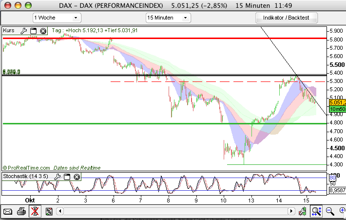 The Dow opened the day with another huge burst of strength this morning, as the index rallied strongly out of the gate for an early 405 point gain, as seen in the 15 Minute Chart. However, the Dow topped out at 9,800 and dropped 700 points before closing the day with a modest bounce and a 77 point loss.