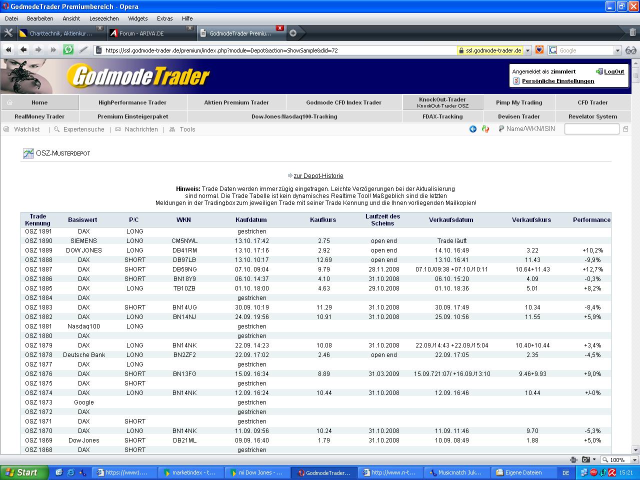 Ich habe das Godmode knock out abo,weil du ja vorhin im Bullen-thread gefragt hast,wer das abonniert hat.Allerding benutze ich das eher aus informativen zwecken,weil man öfters am tag chartinfos erhält,die's auf der HP nicht gibt.Die Depotperfomance finde ich eher durchwachsen.Vorhin sind die eben bei 4985 long gegangen mit ziel 5100.mal schauen was' wird.Ich trade gaaanz selten danach.