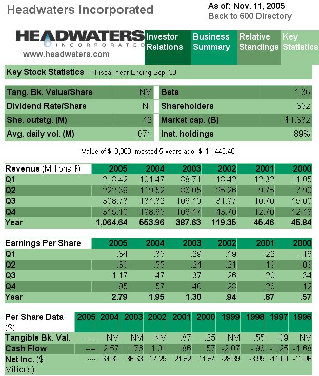 Shares of Headwaters closed Tuesday at $32.43, up 4.7% for the past 12 months but nearly 30% below their late July 52-week high of $45.75. Based on the current share price, Headwaters has a market capitalization of $1.35 billion and trades for 12 times 2005 earnings. Analysts look for the company’s earnings to grow 24% annually over the next five years, giving Headwaters a price-to-earnings growth (PEG) ratio of 0.49.