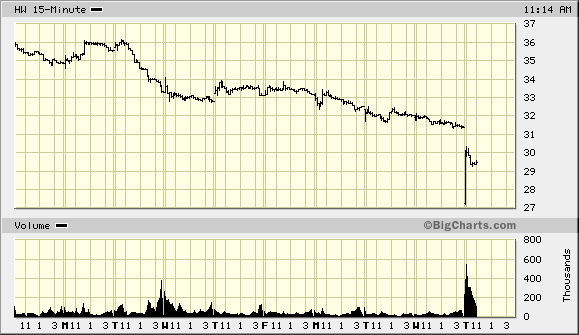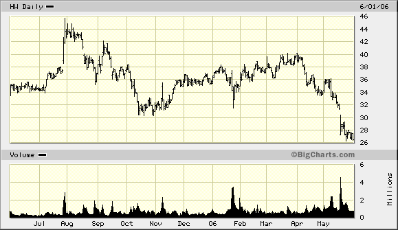 Aufgrund dessen hat HW gesagt, die Gewinne für 2006 würden zwischen 2 Dollar und 2,70 Dollar liegen. Da die Börse Unklarheit nicht mag (die Gewinnspanne ist zu breit) wird verkauft nach dem Prinzip: Erst verkaufen, später Fragen stellen.