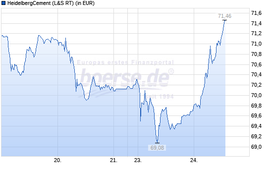 HeidelbergCement 71,42 Euro Aktie konsolidie­rt sich momentan für höhere Aufgaben! Gerade eben angesprung­en 71,52 €. Dürfte im heutigen Handelsver­lauf die 72 € überwinden­.