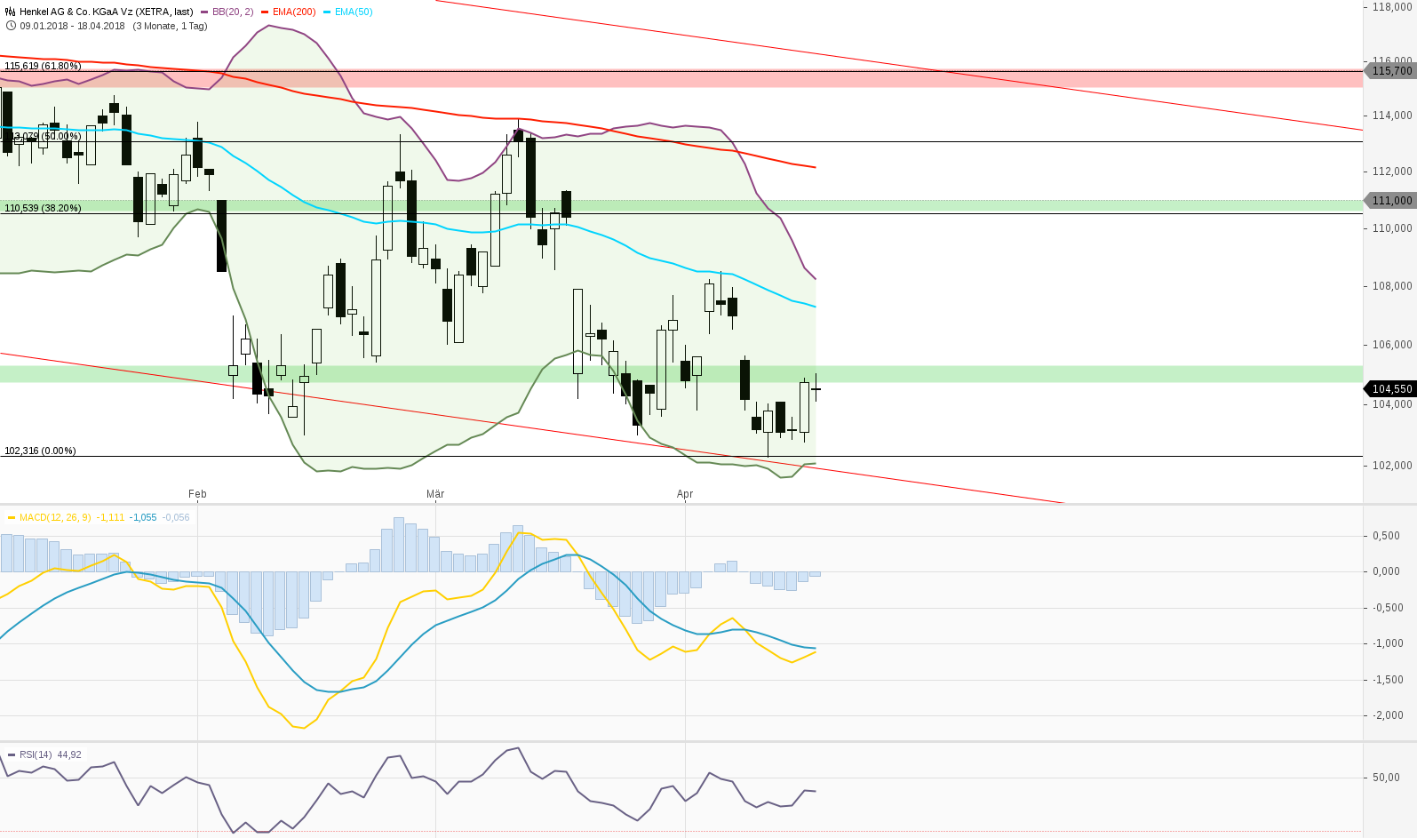 Wie ich es bereits in meiner letzten Betrachtung, vom 05.03.18 prognostiziert hatte, hat sich die Korrektur für die Aktie von Henkel weiter fortgesetzt. Natürlich fand der Preisabschlag in einem verträglichen Rahmen statt; eine crashartige Performance hatte ich auch nicht erwartet. Mit dieser Bewegung wird auch meinem inzwischen über vier Jahre alten langfristigen Szenario, wie der obere Chart zeigt, weitere Bestätigung zuteil. Doch zeigt dieser Chart auch, daß die Korrektur noch über spürbares Potenzial verfügt und auch in temporärer Hinsicht längst noch nicht am Ende ist https://de.investing.com/analysis/article-200223061