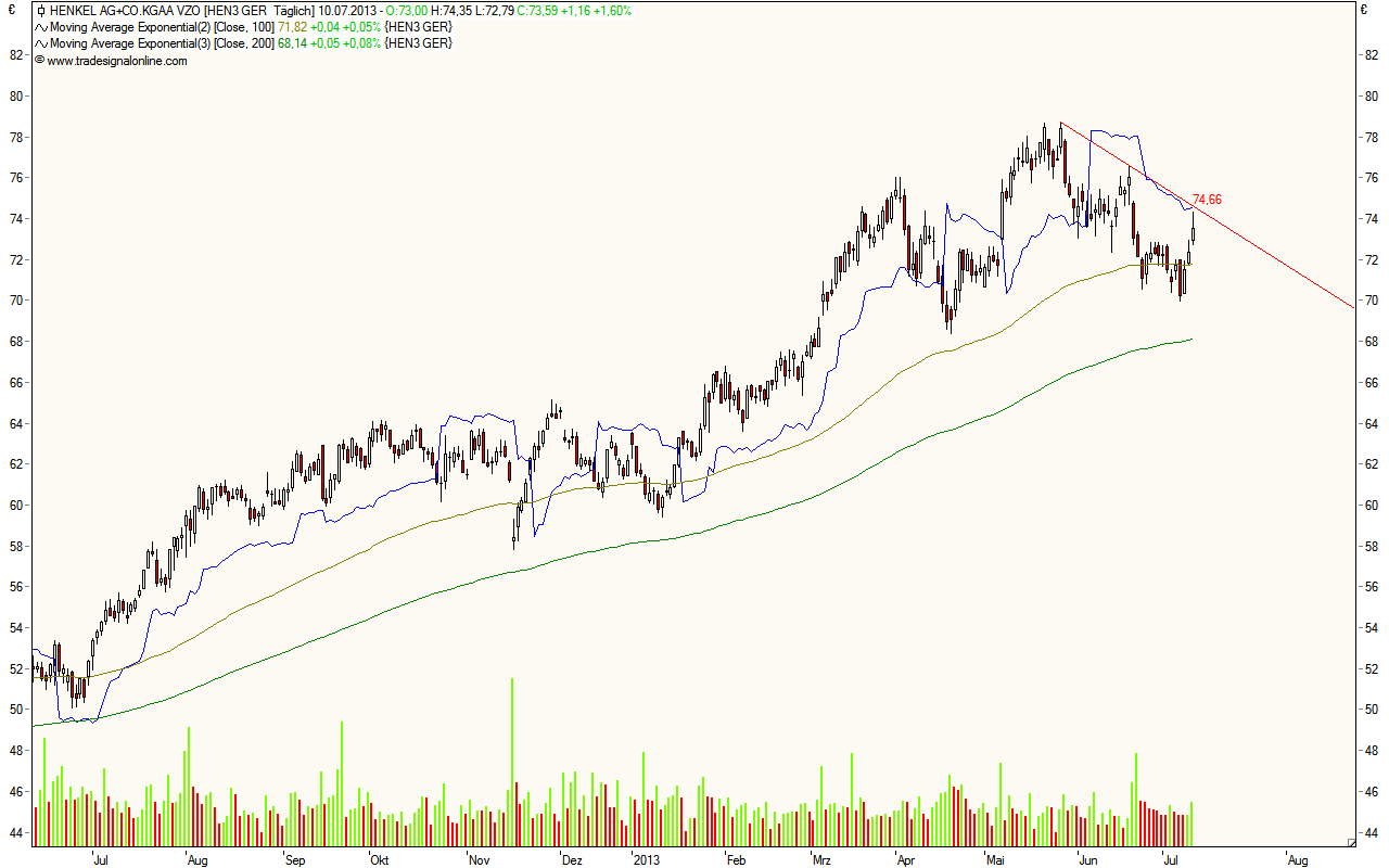 Offensichtlich haben viele die Flagge erkannt, ich bin auch bei ca. 71 rein und erwarte, dass die Vz. Über die aktuelle kurzfristige Abwärtstrendlinie laufen, denn die untere Trendlinie seit Mitte 2012 wird wahrscheinlich halten. (Sofern HKL als grundsolides Unternehmen nicht irgendwelche Hiobsbotschaften zu verkünden hat, was ich aber nicht annehme).
