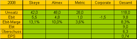 Nur Metric wirft noch einige Fragen auf. Ob es da an Sonderfaktoren lag, das man trotz nur 6,1 Mio € Umsatz in Q4 einen Gewinn gemacht hat, oder obs einfach an erfolgreicher Restrukturierung lag, ist noch nicht endgültig zu sagen. Trotzdem lassen die letzten Aussagen darauf schließen, das 2008 ein kleiner operativer Gewinn hängenbleibt.