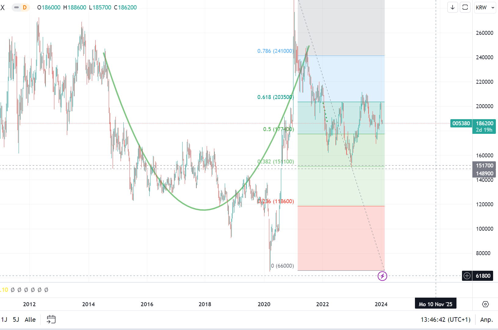 Mit einem KGV von 3 dürfte das Papier die mitunter billigste Autoaktie der Welt sein. Der Wert sei in den letzten Wochen um fast 50% von 20.000 auf 49.000 Koreanisch­e Won (KWN) angestiege­n. Allerdings­ seien vor einem Jahr noch 50.000 KWN gezahlt worden.