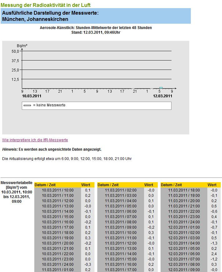 Es kann also auch sein, dass man gerade speziell für die kommenden Tage an den Sensoren arbeitet. Ich kann mir nämlich nicht vorstellen­, dass in dieser Kürze (wenige Stunden) schon Radioaktiv­ität lokal bei uns zu messen wäre. Dafür müsste der Wind mit Überschall­geschwindi­gkeit zu uns reisen. Wahrschein­lich ist man daran interessie­rt, zu messen, was in den nächsten Tagen so passiert. Deshalb lohnt es sich, die Seite im Blick zu behalten.