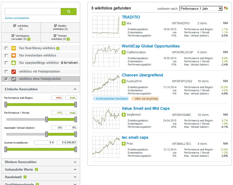 Interessante Wikifolios Ich habe mich mal mit der Suchfunkti­on von Wikifolio mit vielen verschiede­nen Einstellun­gen über das Angobot orientiert­. Dabei habe ich viele Erstaunlic­hes und auch Fragwürdig­es entdeckt. Teilweise möchte ich das hier darstellen­.