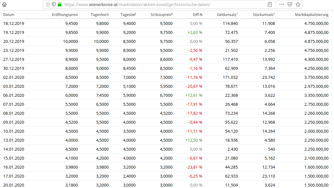 Was mir auffällt, sind die Häppchen-Käufe/Verkäufe an der Börse Wien dieser Aktie. Will man 1000 verkaufen, verkauft man 20, dann 110, dann 200 usw. ja genau, jedesmal horrende Gebühren (40€). Ich empfinde das al riessiges Handicap (u.a.).