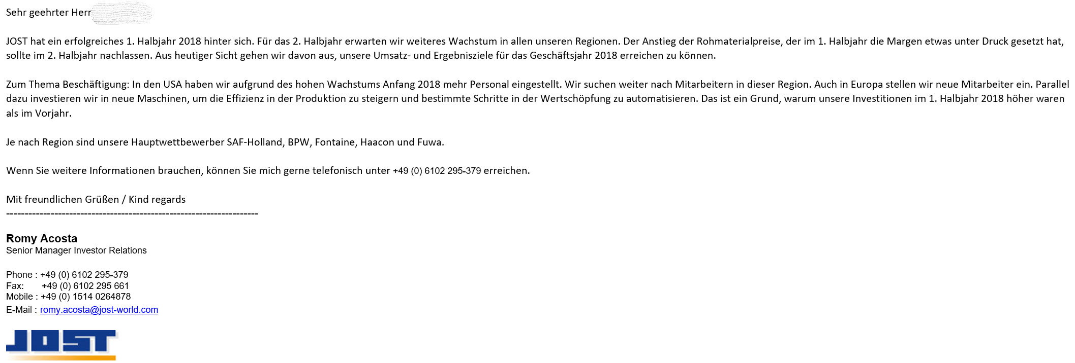Es gibt in meinen Augen bis auf das Marktgeschehen keine Gründe bisher Jost zu verkaufen. Auch in Zeiten evtl. kommender E-Mobilität, trifft es Jost nicht negativ.